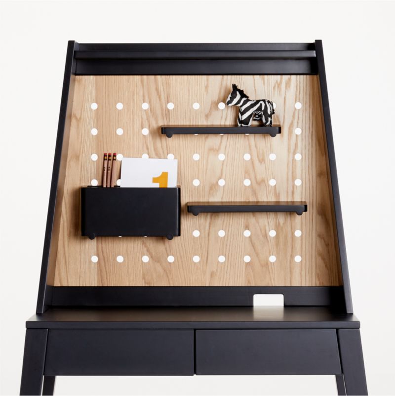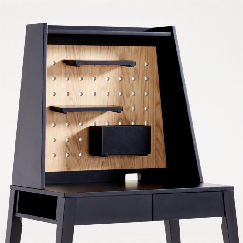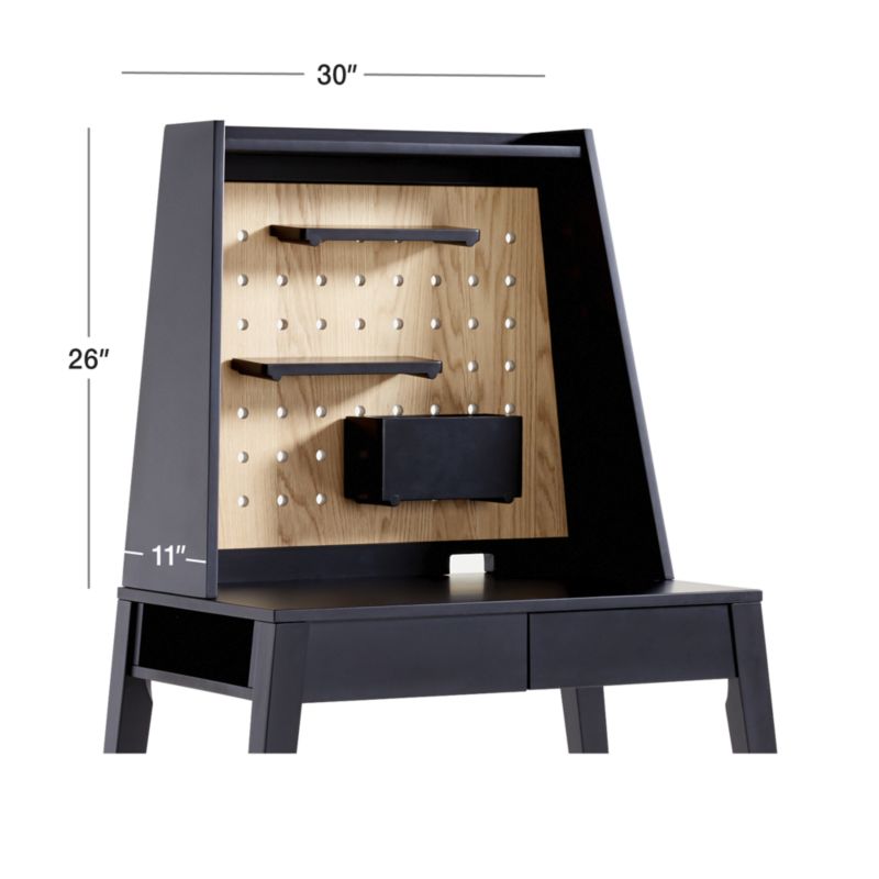 Simplify study space organization by adding this convenient hutch to our Atticus Desk. It features a modular pegboard system that allows your little learner to customize their own storage. Plus, there's an additional shelf up top, and easy access to the desk's integrated power outlet through the bottom of the hutch.