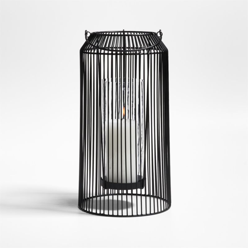 Slender black wires shape a large lantern with graphic appeal, the repeating verticals creating the look of pinstripes. A candle platform floats within the cage, suspended for an airy look and sliding out when it's time to light or replace a pillar candle (sold separately). The modern lantern adds bold linear design and soft illumination to indoor and sheltered outdoor spaces.