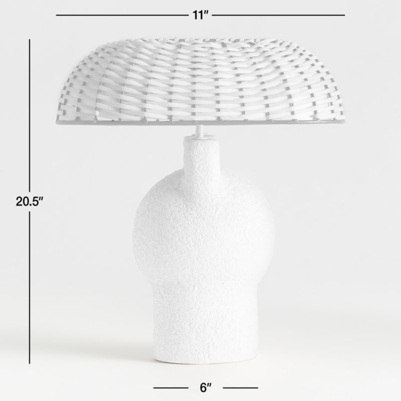 A mix of organic textures shapes a modern table lamp with artisanal appeal. Handwoven of natural and black-dyed rattan, the slim basket shade extends to cover two lightbulbs. The sculptural base calls to mind an ancient piece of pottery, with sculptural swells and a richly textured finish. A natural fit for a sunroom, bedroom or living room, our Avena table lamp is a Crate and Barrel exclusive.