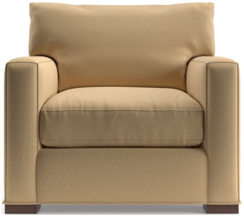 The quality and comfort of our Axis collection is legendary. Casual and inviting, the chair offers exceptional, long-lasting durability. An angled back and deep seat cushion filled with a plush feather-down blend encourage lounging, while track arms give the chair the clean look and modern style that make Axis a Crate & Barrel icon.