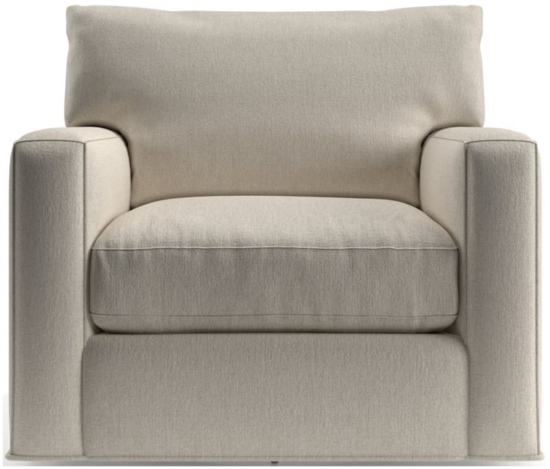 The quality and comfort of our Axis collection is legendary. Casual and inviting, the swivel chair offers exceptional, long-lasting durability. An angled back and deep seat cushion filled with a plush feather-down blend encourage lounging, while track arms give the chair the clean look and modern style that make Axis a Crate & Barrel icon.