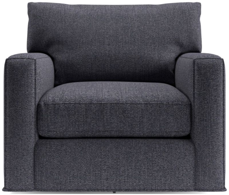 The quality and comfort of our Axis collection is legendary. Casual and inviting, the swivel chair offers exceptional, long-lasting durability. An angled back and deep seat cushion filled with a plush feather-down blend encourage lounging, while track arms give the chair the clean look and modern style that make Axis a Crate & Barrel icon.