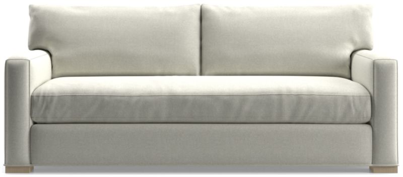 Same easygoing appeal, same pile-on comfort, and a sleek new bench cushion for this enduring customer favorite. Axis is well-loved for its deep seats and low back cushions that encourage lounging in family rooms and casual living rooms. The sofa looks refreshed with shale-stained maple legs and a hardworking chenille fabric with a hint of texture and a soft hand. The Axis bench-seat sofa is a Crate & Barrel exclusive.