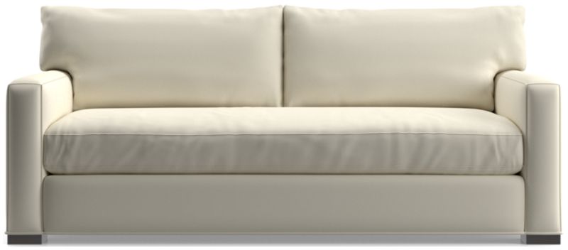 Same easygoing appeal, same pile-on comfort, and a sleek new bench cushion for this enduring customer favorite. Axis is well-loved for its deep seats and low back cushions that encourage lounging in family rooms and casual living rooms. The sofa looks refreshed with shale-stained maple legs and a hardworking chenille fabric with a hint of texture and a soft hand. The Axis bench-seat sofa is a Crate & Barrel exclusive.