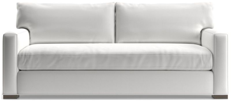 Same easygoing appeal, same pile-on comfort, and a sleek new bench cushion for this enduring customer favorite. Axis is well-loved for its deep seats and low back cushions that encourage lounging in family rooms and casual living rooms. The sofa looks refreshed with shale-stained maple legs and a hardworking chenille fabric with a hint of texture and a soft hand. The Axis bench-seat sofa is a Crate & Barrel exclusive.