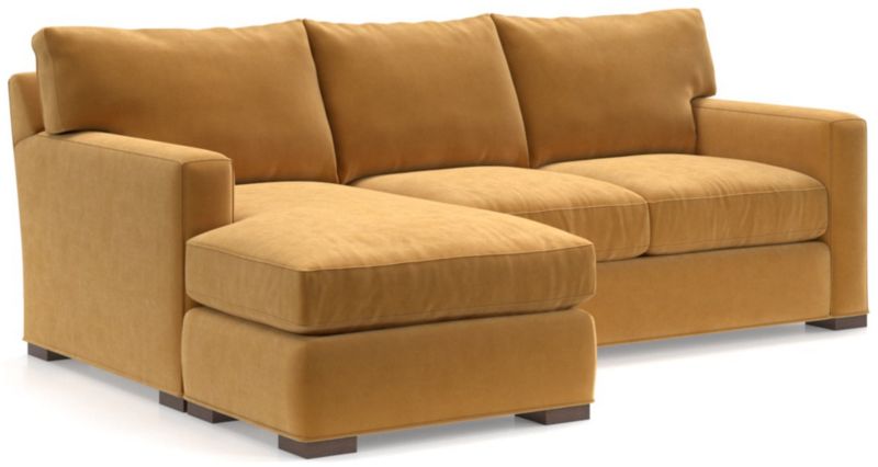 The quality and comfort of our Axis collection is legendary. Casual and inviting, the lounger offers exceptional, long-lasting durability. The sofa creates the look of a sectional with a smaller footprint and more flexibility—simply move the storage ottoman to the left or right side of the sofa and flip the chaise cushion. An angled back and deep seat cushions filled with a plush feather-down blend encourage lounging, while track arms give the sofa the clean look and modern style that make Axis a Crate & Barrel icon.