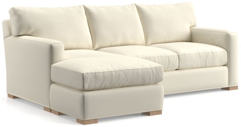 The quality and comfort of our Axis collection is legendary. Casual and inviting, the lounger offers exceptional, long-lasting durability. The sofa creates the look of a sectional with a smaller footprint and more flexibility—simply move the storage ottoman to the left or right side of the sofa and flip the chaise cushion. An angled back and deep seat cushions filled with a plush feather-down blend encourage lounging, while track arms give the sofa the clean look and modern style that make Axis a Crate & Barrel icon.