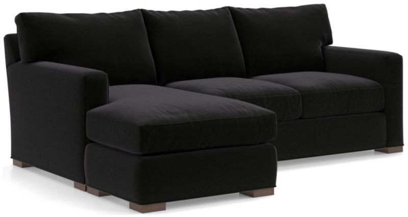 The quality and comfort of our Axis collection is legendary. Casual and inviting, the lounger offers exceptional, long-lasting durability. The sofa creates the look of a sectional with a smaller footprint and more flexibility—simply move the storage ottoman to the left or right side of the sofa and flip the chaise cushion. An angled back and deep seat cushions filled with a plush feather-down blend encourage lounging, while track arms give the sofa the clean look and modern style that make Axis a Crate & Barrel icon.