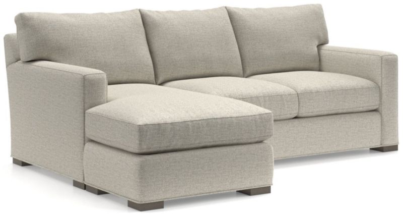 The quality and comfort of our Axis collection is legendary. Casual and inviting, the lounger offers exceptional, long-lasting durability. The sofa creates the look of a sectional with a smaller footprint and more flexibility—simply move the storage ottoman to the left or right side of the sofa and flip the chaise cushion. An angled back and deep seat cushions filled with a plush feather-down blend encourage lounging, while track arms give the sofa the clean look and modern style that make Axis a Crate & Barrel icon.