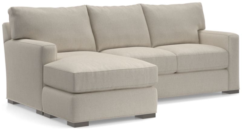 The quality and comfort of our Axis collection is legendary. Casual and inviting, the lounger offers exceptional, long-lasting durability. The sofa creates the look of a sectional with a smaller footprint and more flexibility—simply move the storage ottoman to the left or right side of the sofa and flip the chaise cushion. An angled back and deep seat cushions filled with a plush feather-down blend encourage lounging, while track arms give the sofa the clean look and modern style that make Axis a Crate & Barrel icon.