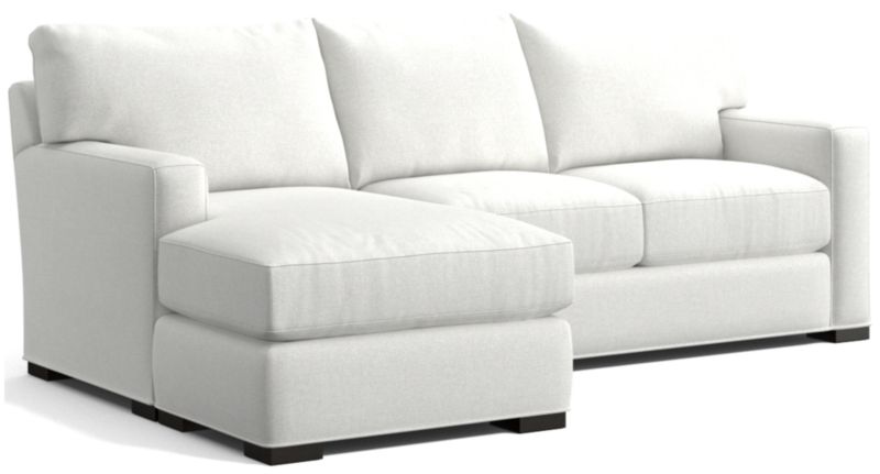 The quality and comfort of our Axis collection is legendary. Casual and inviting, the lounger offers exceptional, long-lasting durability. The sofa creates the look of a sectional with a smaller footprint and more flexibility—simply move the storage ottoman to the left or right side of the sofa and flip the chaise cushion. An angled back and deep seat cushions filled with a plush feather-down blend encourage lounging, while track arms give the sofa the clean look and modern style that make Axis a Crate & Barrel icon.