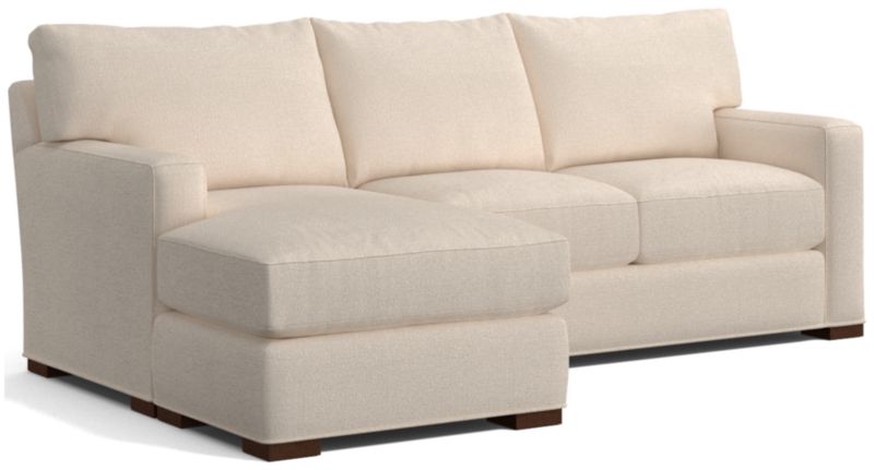 The quality and comfort of our Axis collection is legendary. Casual and inviting, the lounger offers exceptional, long-lasting durability. The sofa creates the look of a sectional with a smaller footprint and more flexibility—simply move the storage ottoman to the left or right side of the sofa and flip the chaise cushion. An angled back and deep seat cushions filled with a plush feather-down blend encourage lounging, while track arms give the sofa the clean look and modern style that make Axis a Crate & Barrel icon.