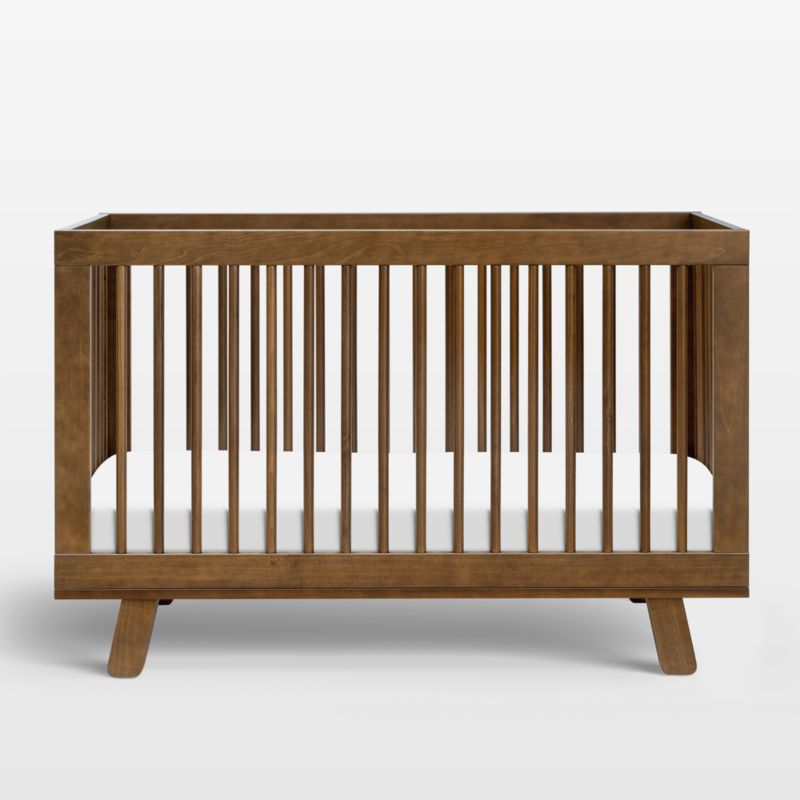 We love the modern mid-century design vibe of this bestselling Babyletto Hudson 3-in-1 convertible crib—from the stylish round spindles to the angled stance of the legs. And the solid New Zealand pine with its warm walnut finish makes a gorgeous statement in any nursery, perfect for pairing with both neutral and colorful crib bedding. Designed for newborns to 4-year-olds, the Hudson crib easily transitions from crib to toddler bed to daybed with the included toddler rail and conversion kit.
