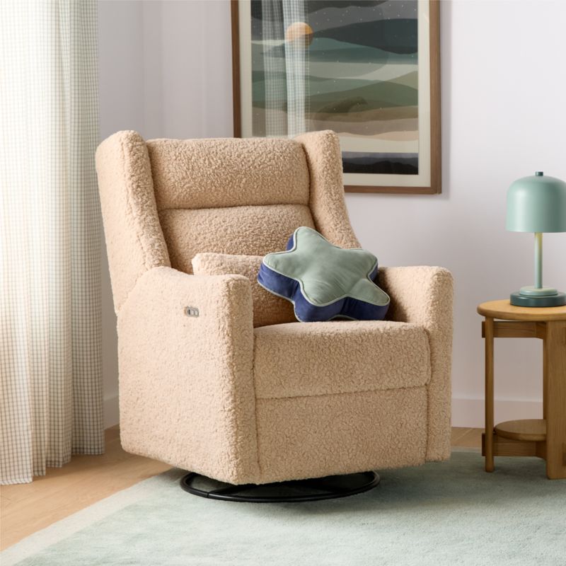 The Babyletto Kiwi Deluxe power recliner and glider provides nurseries with sleek style, comfort and even some self-care time. A hidden control panel in the armrest features buttons that allow you to control the recline, turn on a heated seat, and even activate a soothing power massage and lumbar support for your back. And that's not all—a USB charging port keeps electronics conveniently on hand. The chair swivels with a smooth gliding motion, so you won't disrupt your little one's sleep while you get comfortable. Its shearling upholstery feels ultra-cozy, and it contrasts with the metal swivel base for a subtle touch of luxury.