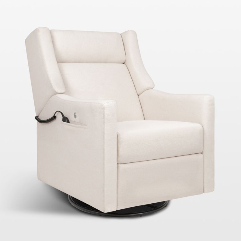 The Babyletto Kiwi Deluxe power recliner and glider provides nurseries with sleek style, comfort and even some self-care time. A hidden control panel in the armrest features buttons that allow you to control the recline, turn on a heated seat, and even activate a soothing power massage and lumbar support for your back. And that's not all—a USB charging port keeps electronics conveniently on hand. The chair swivels with a smooth gliding motion, so you won't disrupt your little one's sleep while you get comfortable. Its cozy performance upholstery in a neutral cream hue is both stain-resistant and water-repellent, and it contrasts with the metal swivel base for a subtle touch of luxury.