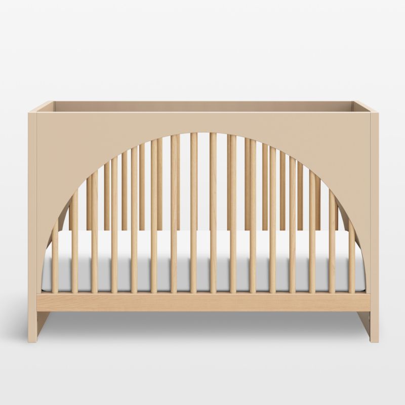 Inspired by pop art and postmodernism, Babyletto's Moab convertible crib features playful arches and modern tambour detailing on the side panels. The sculptural crib is a true art piece that's sure to be a style standout in any nursery. Four adjustable mattress height settings grow with your little one, and a bed rail (sold separately) helps the crib transition to the toddler years: It easily transforms into a toddler bed, then a daybed for lounging.