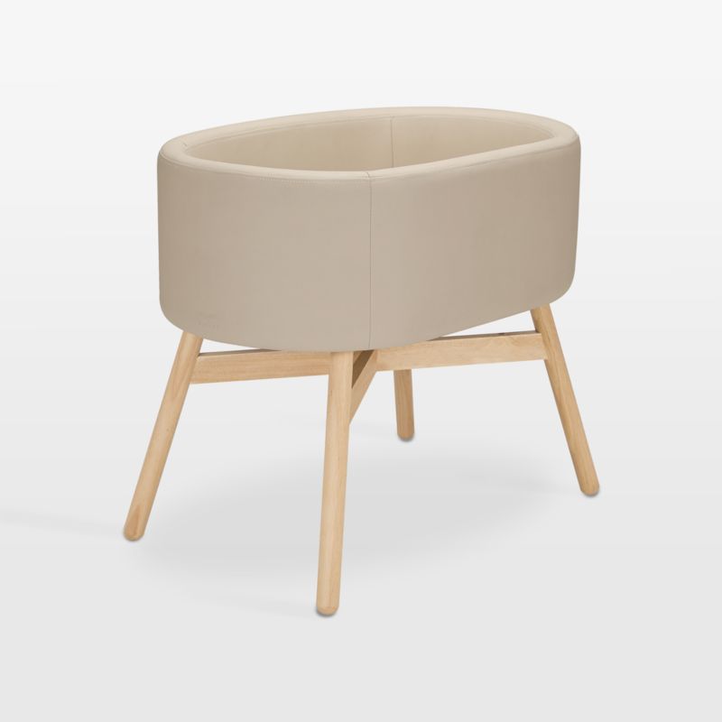 Give your newborn a beautiful first sleeping place with the Babyletto x Gathre Capsule Bassinet. It's upholstered with buttery-soft, tan vegan leather that's wipeable and waterproof for easy cleaning. The sleek, capsule-shaped basket sits on durable, rounded hardwood legs and includes a comfy padded insert. The mixed-material design will be at home pretty much anywhere, from the nursery to the family room or the parents' bedroom. The compact design is a smart choice for small spaces, and it's designed to grow with your little one: Once they've moved on to their crib, simply remove the bassinet's legs and it becomes stylish toy storage.