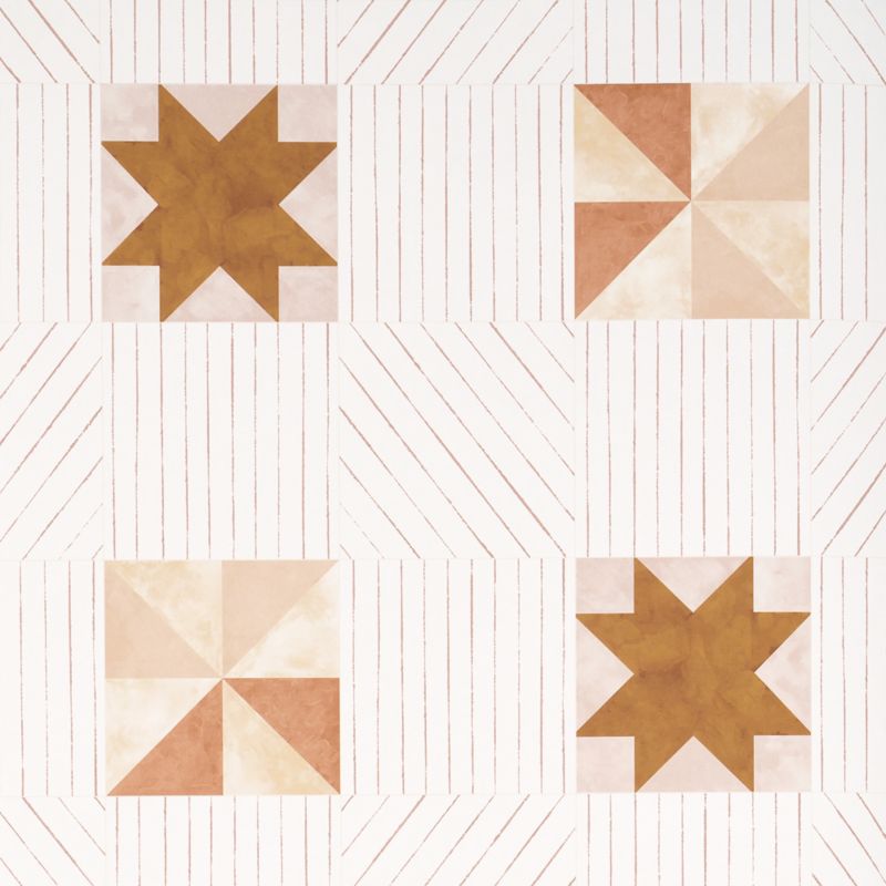 Elegant quilting patterns inspired this lively geometric wallpaper design by Backdrop. Desert-hued terracotta star motifs and warm peach pinwheels are accented by a delicate multidirectional stripe background, giving the walls of any kid's room a charming, heirloom-quality feel. Based on handcrafted art, the wallpaper is printed with subtle texture on a non-woven material.