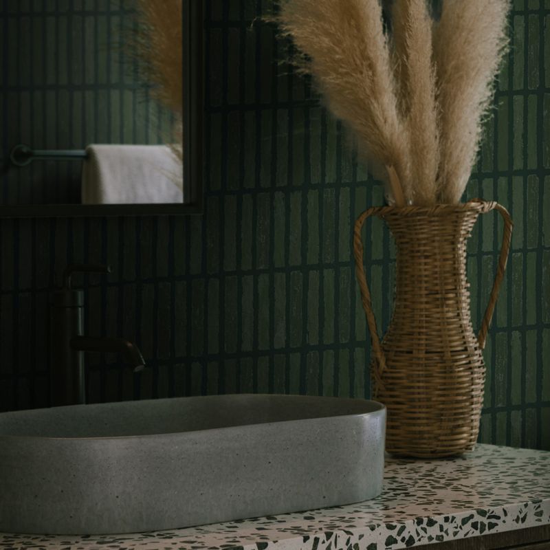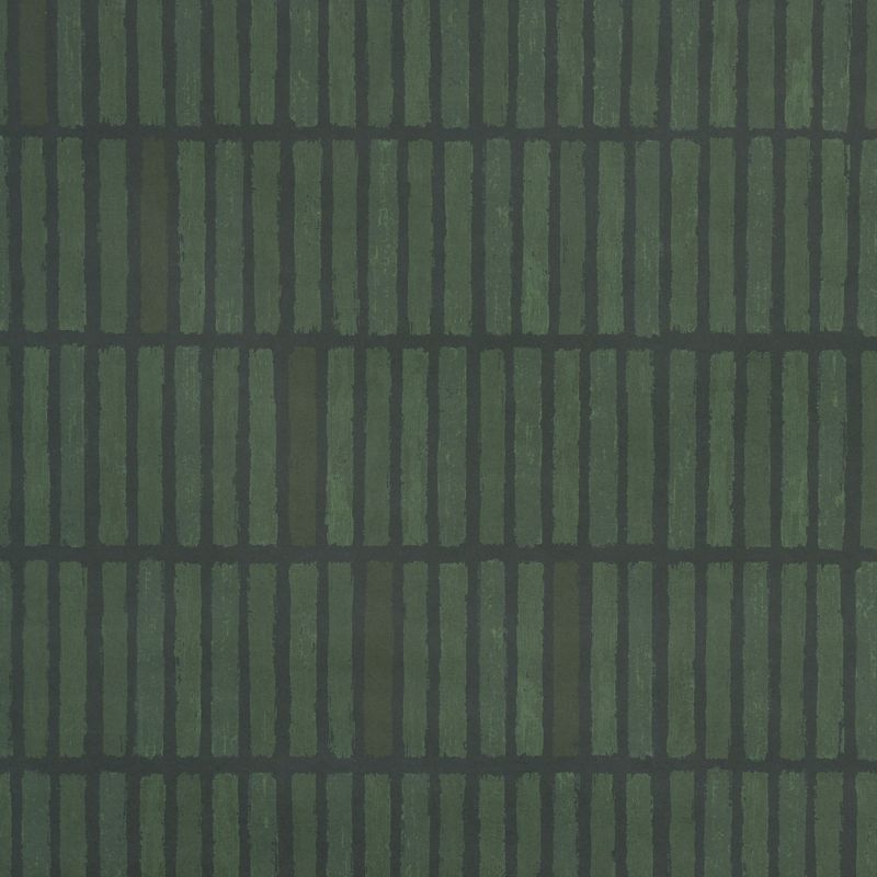 Inspired and named after the Japanese aesthetic philosophy, Wabi-Sabi by Backdrop offers a playful, artsy take on a modern geometric pattern. The grid design, softened by textured edges and subtle tonal variations, has an eye-catching stripe effect in a dark moss green hue. A unique kid's decor idea with endless installation possibilities, the wallpaper is based on handcrafted art and printed on a non-woven material.