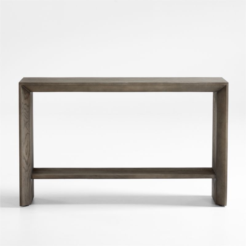 Named after the natural beauty found in the Baja Peninsula, this large console table celebrates the organic richness of solid white oak. The table uses simple geometry and a light grey stain to put the focus on the wood's unique grain, knots and markings. Reverse chamfer edges open up the clean waterfall silhouette, drawing the eye inward toward the low, full-length shelf. Rustic and timeless, the Baja grey oak console table is a Crate & Barrel exclusive.