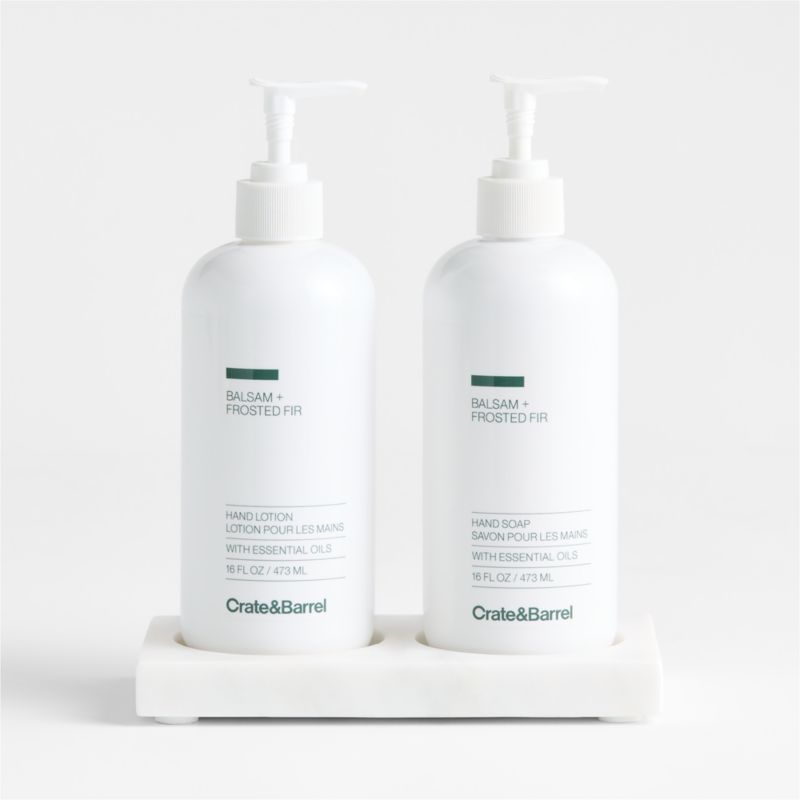 Clean and soothe hands with the crisp fragrances of the winter woods showcased in this three-piece set. Our gentle hand soap moisturizes with sunflower seed oil and aloe vera as it cleans, while the hand lotion boasts mango seed oil and aloe. Both leave behind an invigorating aroma of pine, cypress and other evergreens against a backdrop of fruity mistletoe and apple. Echoing the enticing smells of baking and cooking, our exclusive kitchen scent collection features plant-based formulas with deliciously fragrant combinations of essential oils. Cut, finished and polished by hand, the white marble caddy keeps the bottles right at hand while looking neat and stylish.