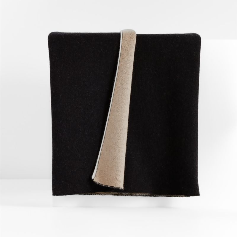 The ultimate in cozy luxury, cashmere weaves an irresistibly soft throw blanket. Made of a blend of recycled cashmere and wool in inky black, the blanket reverses to a warm natural hue, getting a pop of contrast from a crisp outline of white piping. Tossed on a sofa, armchair or bed with the coordinating Bardot pillow, our exclusive throw layers on warmth and indulgence throughout the cooler months.