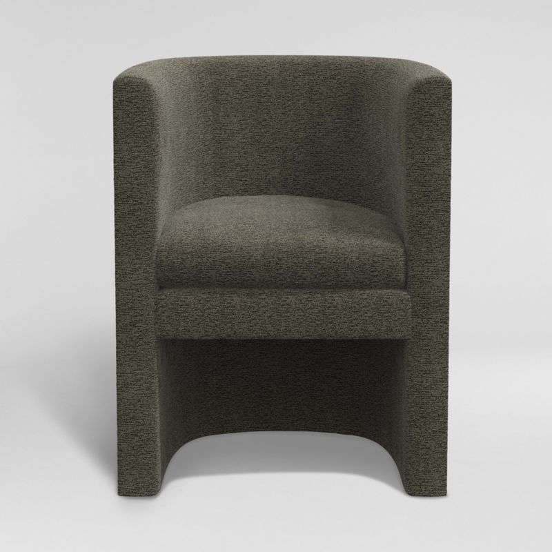 Barkley streamlines the sheltering charm of the classic barrel design into a sculptural chair for the modern dining room. The chair's seamless contours flow a U-shaped, top-to-bottom frame that floats a neat cushioned seat. Expertly tailored, the grey bouclé upholstery brings a hint of texture to every curve and line, enhancing the chair's striking silhouette. The Barkley dining chair is a Crate & Barrel exclusive.