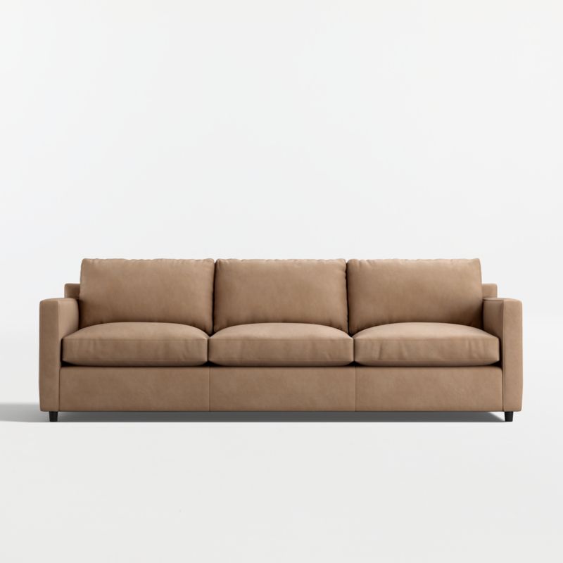 Barrett makes leather seating comfortable, casual and modern. Like fine leather apparel, the full-grain leather feels buttery to the touch and tailors the sofa's clean lines with a graceful drape. The sofa sits upright and comfortable and is styled with track arms, topstitching and recessed legs that float its stylish silhouette. The Barrett leather sofa is a Crate & Barrel exclusive.