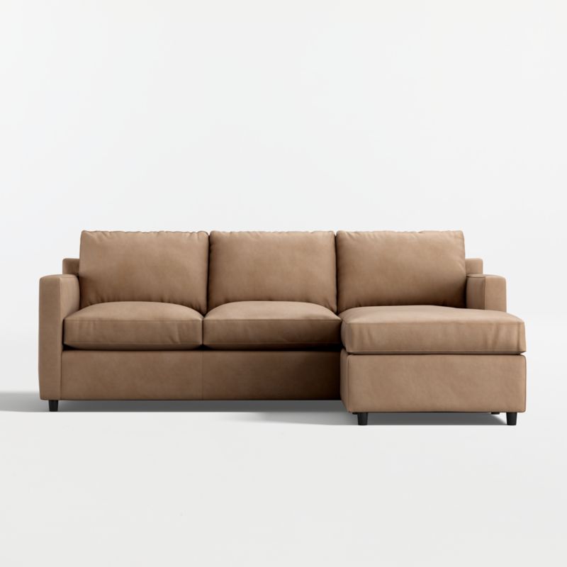 Barrett makes leather seating comfortable, casual and modern. Like fine leather apparel, the full-grain leather feels buttery to the touch and tailors the sectional's clean lines with a graceful drape. Consisting of a right-arm chaise and left-arm sofa, the two-piece sectional sits upright and comfortable and is styled with track arms, topstitching and recessed legs that float its stylish silhouette.