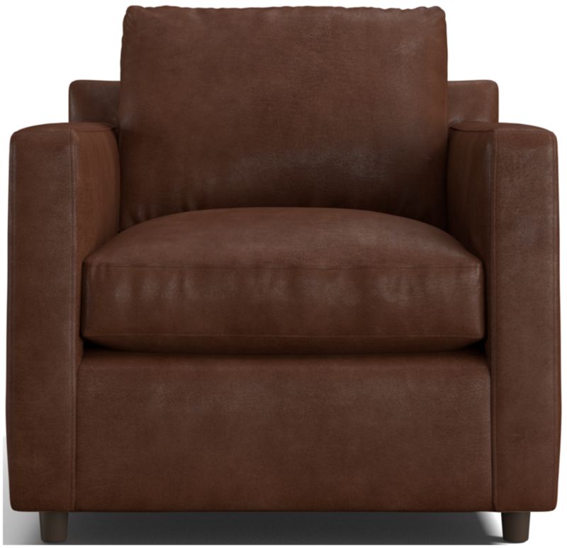 Barrett makes leather seating comfortable, casual and modern. Like fine leather apparel, the full-grain leather feels buttery to the touch and tailors the chair's clean lines with a graceful drape. The chair sits upright and comfortable and is styled with track arms, topstitching and recessed legs that float its stylish silhouette. The Barrett leather track-arm chair is a Crate & Barrel exclusive.