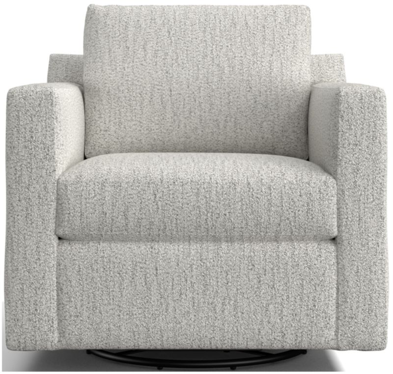 Barrett makes modern affordable and carefree. Upright yet comfortable, this versatile swivel chair is designed to keep its look casual and clean, even in high-traffic family rooms. The Barrett II Track Arm Swivel Chair is a Crate & Barrel exclusive.