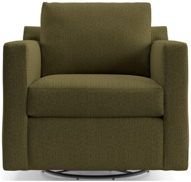 Barrett makes modern affordable and carefree. Upright yet comfortable, this versatile swivel chair is designed to keep its look casual and clean, even in high-traffic family rooms. The Barrett II Track Arm Swivel Chair is a Crate & Barrel exclusive.