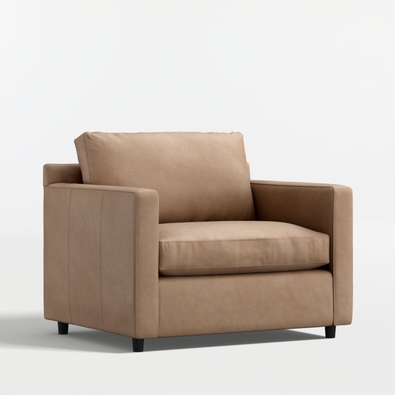 Barrett makes leather seating comfortable, casual and modern. Like fine leather apparel, the full-grain leather feels buttery to the touch and tailors the chair's clean lines with a graceful drape. The chair and half sits upright and comfortable and is styled with track arms, topstitching and recessed legs that float its stylish silhouette. The Barrett leather chair and a half is a Crate & Barrel exclusive.