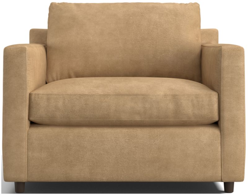 Barrett makes leather seating comfortable, casual and modern. Like fine leather apparel, the full-grain leather feels buttery to the touch and tailors the chair's clean lines with a graceful drape. The chair and half sits upright and comfortable and is styled with track arms, topstitching and recessed legs that float its stylish silhouette. The Barrett leather chair and a half is a Crate & Barrel exclusive.
