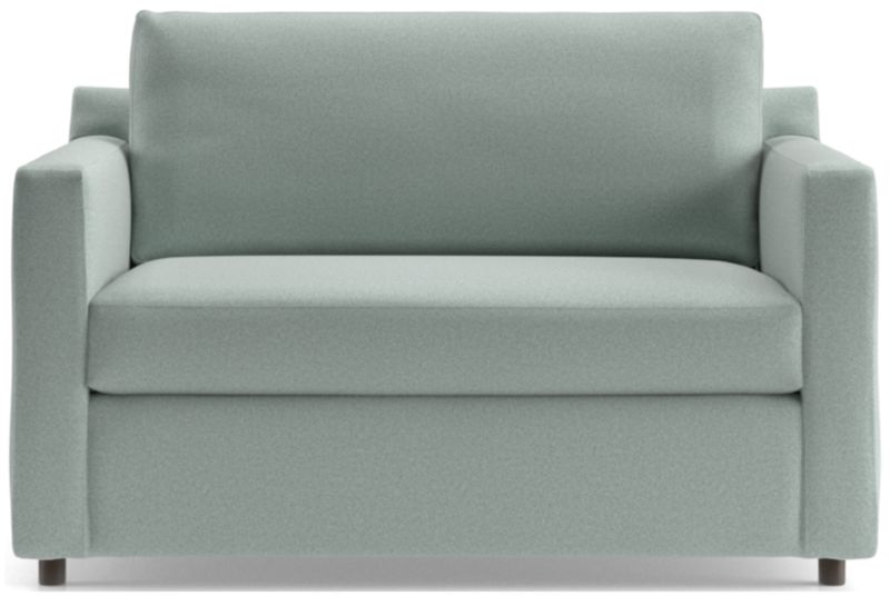 Barrett makes modern affordable and carefree. Upright yet comfortable, this versatile collection looks casual and clean in a contemporary fabric that feels great to the touch and is so durable you don't need to worry about spills or pets. This comfy twin sleeper sofa features a comfortable mattress and a locking tilt-up headrest for reading and media viewing. Designed to always look its best, even in high-traffic family rooms, the twin sleeper sofa dresses up or down to suit your space. The Barrett II Twin Sleeper Sofa is a Crate & Barrel exclusive.
