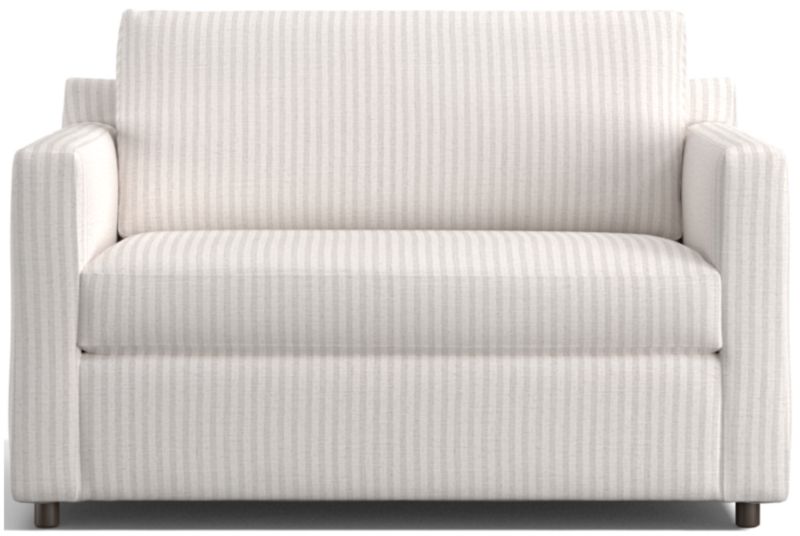 Barrett makes modern affordable and carefree. Upright yet comfortable, this versatile collection looks casual and clean in a contemporary fabric that feels great to the touch and is so durable you don't need to worry about spills or pets. This comfy twin sleeper sofa features a comfortable mattress and a locking tilt-up headrest for reading and media viewing. Designed to always look its best, even in high-traffic family rooms, the twin sleeper sofa dresses up or down to suit your space. The Barrett II Twin Sleeper Sofa is a Crate & Barrel exclusive.