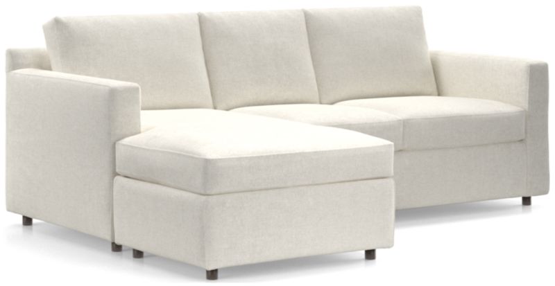 Barrett makes modern affordable and carefree. Upright yet comfortable, this versatile sleeper sofa is designed to keep its look casual and clean, even in high-traffic family rooms. Designed to look like a sectional, the lounger has all the comfort with a smaller footprint that's ideal for smaller spaces, plus the chaise-like cushion and storage ottoman switch from left to right for maximum flexibility. Barrett also fills in when an extra bed is needed, unfolding a comfortable mattress and a locking tilt-up headrest for reading and media viewing. The Barrett II 3-Seat Queen Reversible Sleeper Sectional is a Crate & Barrel exclusive.