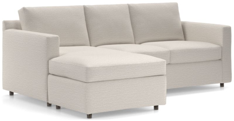 Barrett makes modern affordable and carefree. Upright yet comfortable, this versatile sleeper sofa is designed to keep its look casual and clean, even in high-traffic family rooms. Designed to look like a sectional, the lounger has all the comfort with a smaller footprint that's ideal for smaller spaces, plus the chaise-like cushion and storage ottoman switch from left to right for maximum flexibility. Barrett also fills in when an extra bed is needed, unfolding a comfortable mattress and a locking tilt-up headrest for reading and media viewing. The Barrett II 3-Seat Queen Reversible Sleeper Sectional is a Crate & Barrel exclusive.