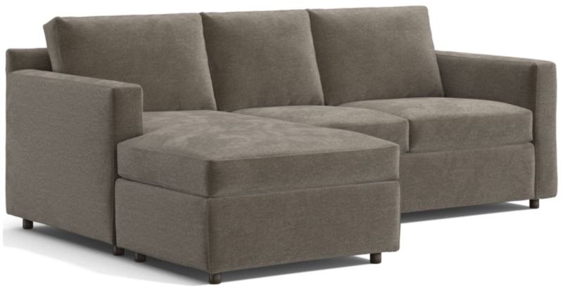 Barrett makes modern affordable and carefree. Upright yet comfortable, this versatile sleeper sofa is designed to keep its look casual and clean, even in high-traffic family rooms. Designed to look like a sectional, the lounger has all the comfort with a smaller footprint that's ideal for smaller spaces, plus the chaise-like cushion and storage ottoman switch from left to right for maximum flexibility. Barrett also fills in when an extra bed is needed, unfolding a comfortable mattress and a locking tilt-up headrest for reading and media viewing. The Barrett II 3-Seat Queen Reversible Sleeper Sectional is a Crate & Barrel exclusive.