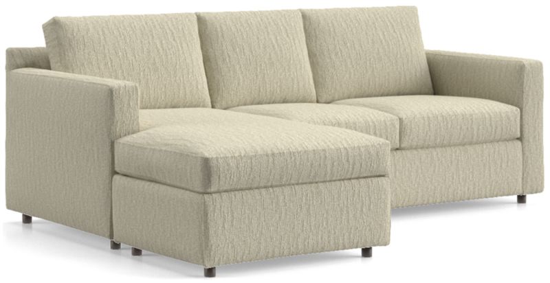 Barrett makes modern affordable and carefree. Upright yet comfortable, this versatile sleeper sofa is designed to keep its look casual and clean, even in high-traffic family rooms. Designed to look like a sectional, the lounger has all the comfort with a smaller footprint that's ideal for smaller spaces, plus the chaise-like cushion and storage ottoman switch from left to right for maximum flexibility. Barrett also fills in when an extra bed is needed, unfolding a comfortable mattress and a locking tilt-up headrest for reading and media viewing. The Barrett II 3-Seat Queen Reversible Sleeper Sectional is a Crate & Barrel exclusive.