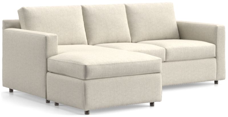 Barrett makes modern affordable and carefree. Upright yet comfortable, this versatile sleeper sofa is designed to keep its look casual and clean, even in high-traffic family rooms. Designed to look like a sectional, the lounger has all the comfort with a smaller footprint that's ideal for smaller spaces, plus the chaise-like cushion and storage ottoman switch from left to right for maximum flexibility. Barrett also fills in when an extra bed is needed, unfolding a comfortable mattress and a locking tilt-up headrest for reading and media viewing. The Barrett II 3-Seat Queen Reversible Sleeper Sectional is a Crate & Barrel exclusive.