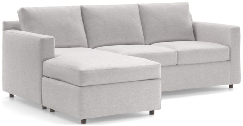 Barrett makes modern affordable and carefree. Upright yet comfortable, this versatile collection looks casual and clean in a contemporary fabric that feels great to the touch and is so durable you don't need to worry about spills or pets. Designed to look like a sectional, the lounger has all the comfort with a smaller footprint that's ideal for smaller spaces, plus the chaise-like cushion and storage ottoman switch from left to right for maximum flexibility. Barrett dresses up or down to suit your space, even in high-traffic family rooms. The Barrett II Reversible Sectional is a Crate & Barrel exclusive.