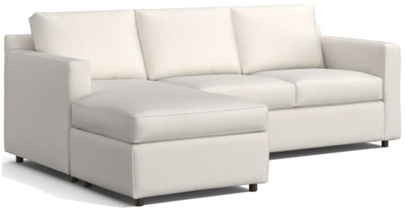 Barrett makes modern affordable and carefree. Upright yet comfortable, this versatile collection looks casual and clean in a contemporary fabric that feels great to the touch and is so durable you don't need to worry about spills or pets. Designed to look like a sectional, the lounger has all the comfort with a smaller footprint that's ideal for smaller spaces, plus the chaise-like cushion and storage ottoman switch from left to right for maximum flexibility. Barrett dresses up or down to suit your space, even in high-traffic family rooms. The Barrett II Reversible Sectional is a Crate & Barrel exclusive.