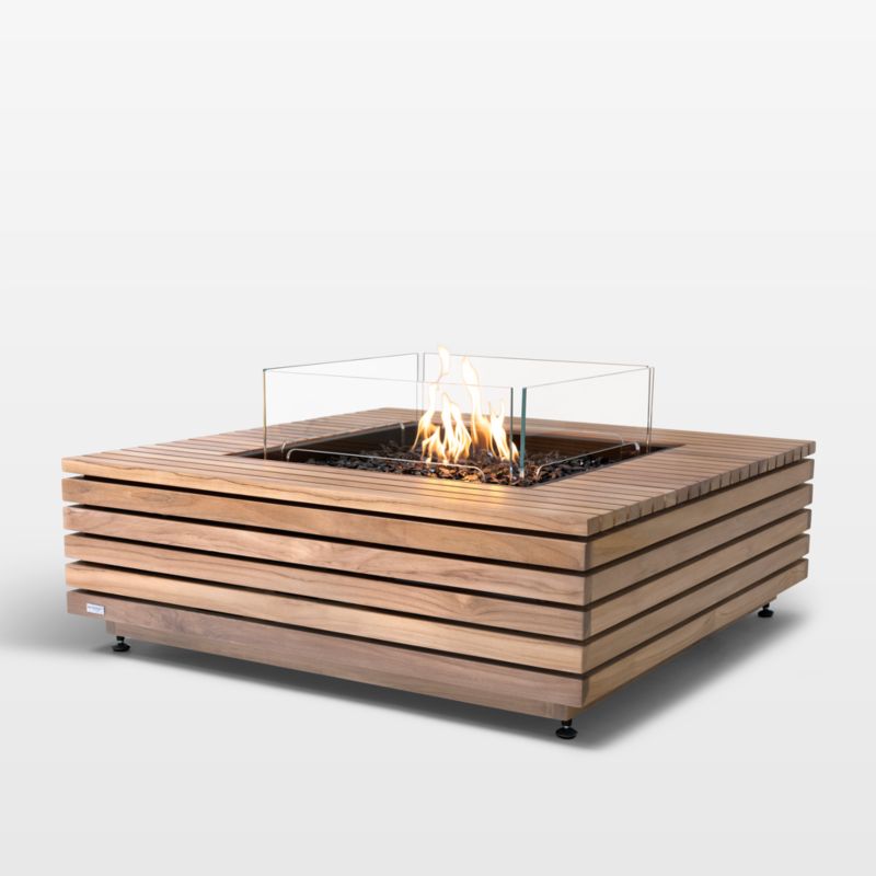 Ideal for entertaining, Base 40 surrounds an inviting smokeless fire with a clean, modern coffee table. Slats of teak wood shape the table with crisp corners, edges wide enough to host a drink and a low silhouette that encourages lounging and conversation. Fueled by your choice of propane, natural gas or ethanol, the square fire table warms and illuminates your outdoor space any time of year.