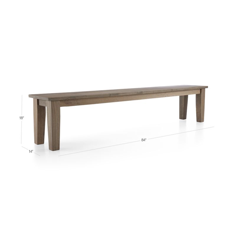Bold in proportion and simple in design, the beauty of this bench lies in the mango wood's active open grain and naturally occurring knots that make each bench unique. Sized to pair with the Basque 104" dining table. Tie on additional comfort with our custom-fitted bench cushion (sold separately). The Basque 84" light brown bench is a Crate and Barrel exclusive.
