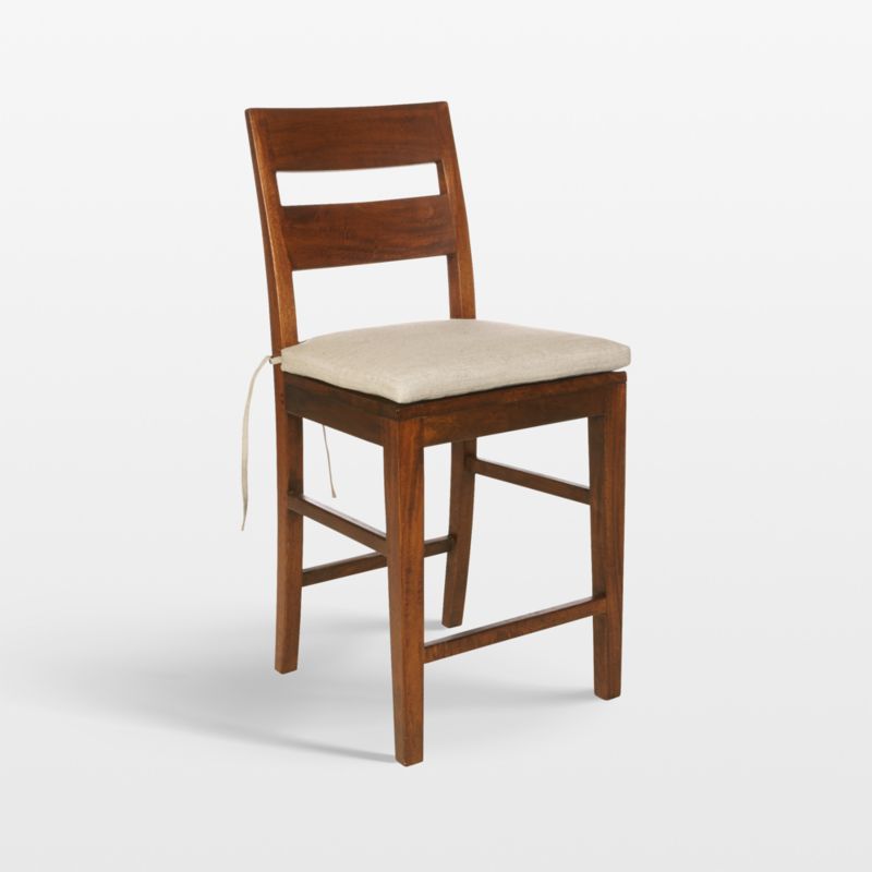 The perfect seating option for kitchen counters or high dining tables, this counter stool recalls the simple, rustic character of a European farmhouse antique. With a strong yet comfortable presence, the generously proportioned bar stool is designed with a tall, modified double-slat back and deep seat. Handcrafted from hand-planed planks of sustainable solid mango wood exhibiting individual grain and knots, each bar stool features authentic peg detailing and a rich honey finish. The custom- fitted cushion provides extra support and a dose of color. The Basque Honey Counter Stool with Cushion is a Crate and Barrel exclusive.