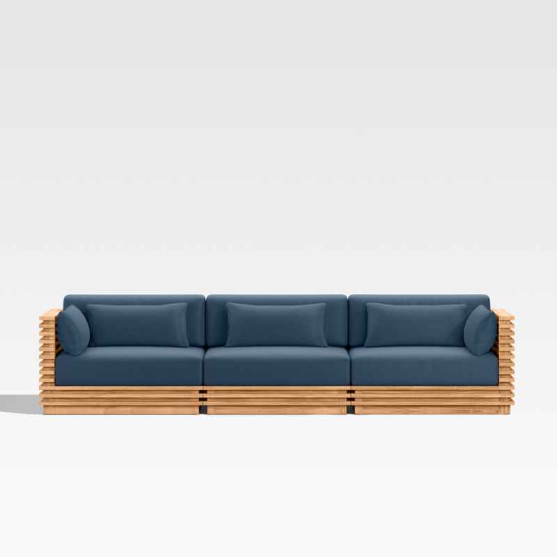 Modern and made for the outdoors, Batten's modular design flexes with your space and entertaining style. Crafted of sustainably sourced, unfinished solid teak, it is built to last a lifetime. The sofa's bold slats, striking linear profile and minimalist silhouette give it a distinctly modern look. A cozy mix of plush seat, back and lumbar cushions plus throw pillows provides unrivaled comfort and can all be upholstered in a weather-resistant fabric of your choice.