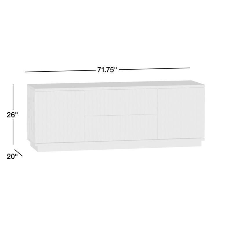 Blending modern design and natural materials, this media console is the perfect solution for organizing and showcasing your entertainment essentials. The credenza is made of beautiful white oak, crafted with vertical slats for a touch of architectural interest. Set on a recessed plinth base, the console presents a rhythmic, linear facade, seamlessly integrating a set of drawers flanked by cabinets. Adjustable shelves and cord-management cutouts let you customize storage and media components.