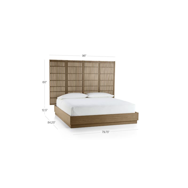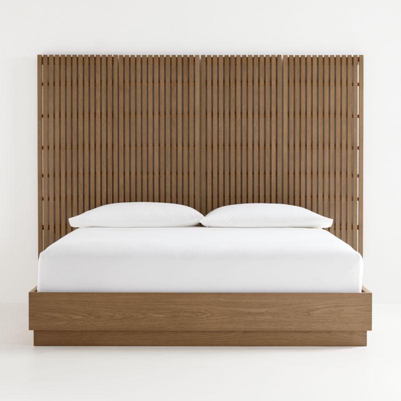 Part of our space-saving Batten modular storage system, four slatted Batten back panels make the perfect backdrop for the king-sized Batten plinth-base bed. Both panels and bed are made of handsome oak veneer finished in smoky grey. To customize your bedroom, add on Batten storage components including a floating nightstand, shelves and hooks.