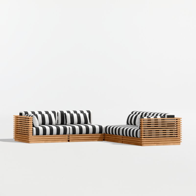 Batten Natural Teak 5-Piece L-Shaped Outdoor Sectional Sofa with Corner Coffee Table & Black and White Cabana Stripe Sunbrella ® Cushions